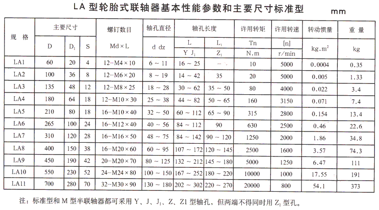 LLA型冶金設(shè)備用輪胎式聯(lián)軸器基本性能參數(shù)和主要尺寸